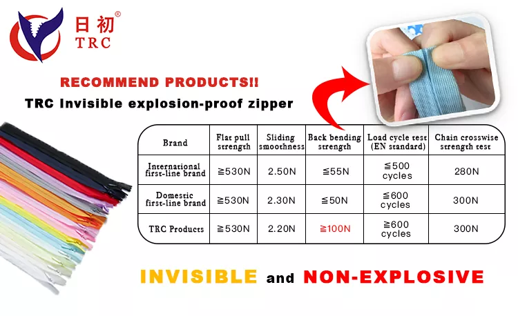 Chaque fermeture éclair antidéflagrante invisible TRC est soigneusement inspectée tout au long de la production, de la sélection des matières premières à l'assemblage final. Des tests rigoureux pour la résistance à la traction, la douceur et la durabilité garantissent des performances constantes, vous offrant une fermeture éclair fiable qui répond aux normes de qualité internationales.
