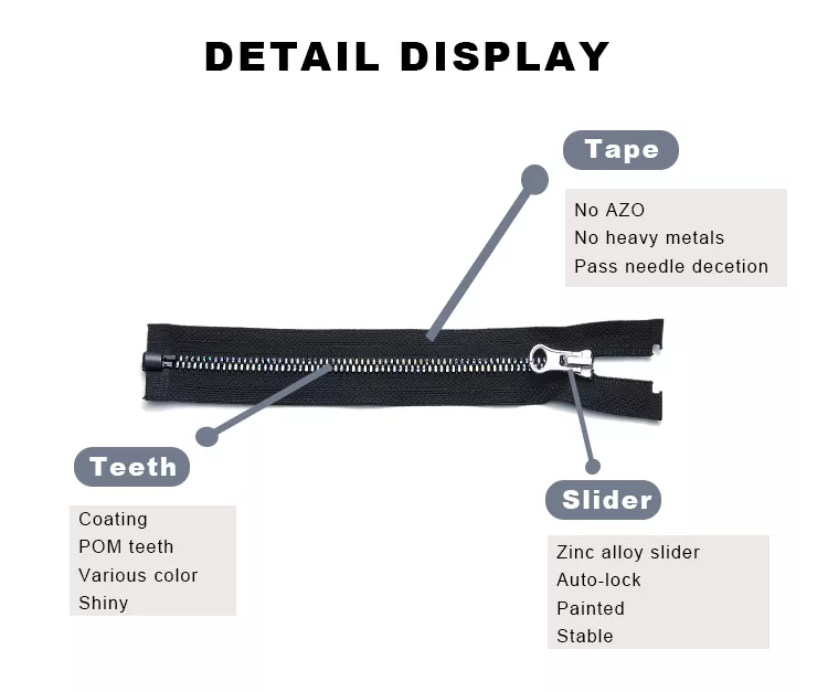 Revêtement protecteur : améliore la résistance à l'oxydation et à la corrosion, conférant à la fermeture éclair un aspect plus raffiné et esthétique.