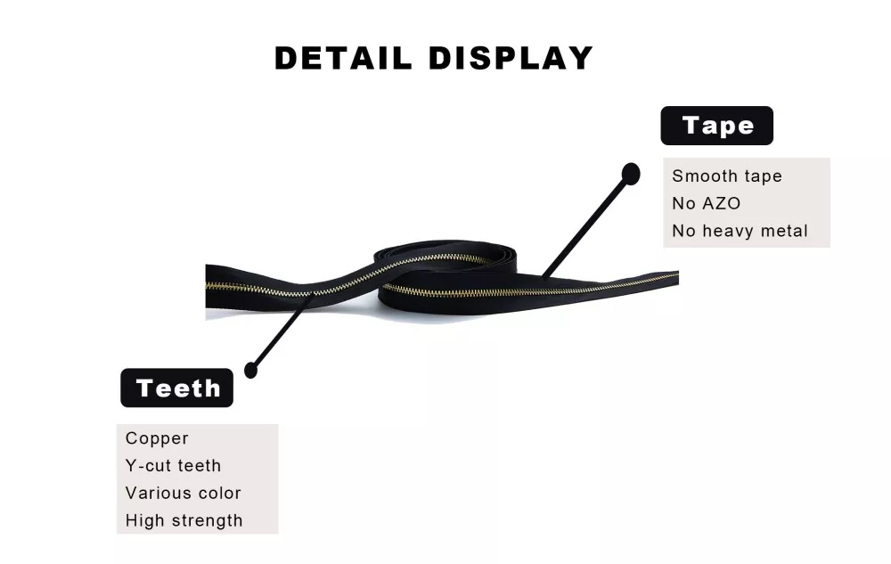 La fermeture éclair en métal standard TRC utilise des dents en laiton ou en nickel à haute résistance, ce qui lui confère une excellente résistance à l'usure, au lavage et aux performances de repassage résistantes à la chaleur. De plus, il est disponible dans des couleurs populaires telles que l'or champagne, ce qui le rend largement adapté aux jeans, vestes et divers autres types de vêtements.