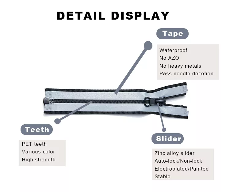 Les fermetures à glissière en nylon imperméables TRC sont fabriquées avec un ruban en polyester haute résistance et des dents en nylon durables, et recouvertes d'une membrane imperméable professionnelle en TPU ou en PU pour bloquer efficacement la pénétration de l'humidité, de la pluie et de la poussière. Et pour répondre aux divers besoins d'applications, TRC propose trois finitions de surface : mate, brillante et semi-mate, chacune avec un aspect et une sensation uniques.