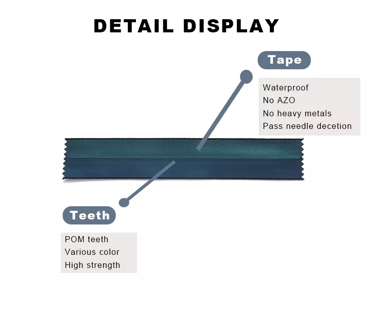 La fermeture éclair en plastique étanche TRC utilise des dents en plastique de haute qualité et un processus de revêtement imperméable professionnel pour garantir une surface lisse et une étanchéité parfaite, empêchant efficacement la pénétration de l'humidité et assurant une performance optimale des vêtements et des équipements dans des conditions humides.
